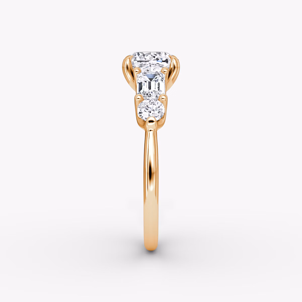 The Mixed Shape engagement ring displays an array of five VRAI created diamonds of varying carat weights and diamond shapes. Choose between Round Brilliant and Pear side stones or Emerald and Round Brilliant side stones to uniquely spotlight your center VRAI created diamond. An instant classic, the Mixed Shape effortlessly blends differing diamond shapes and details to create an unforgettable design as unique as your love.