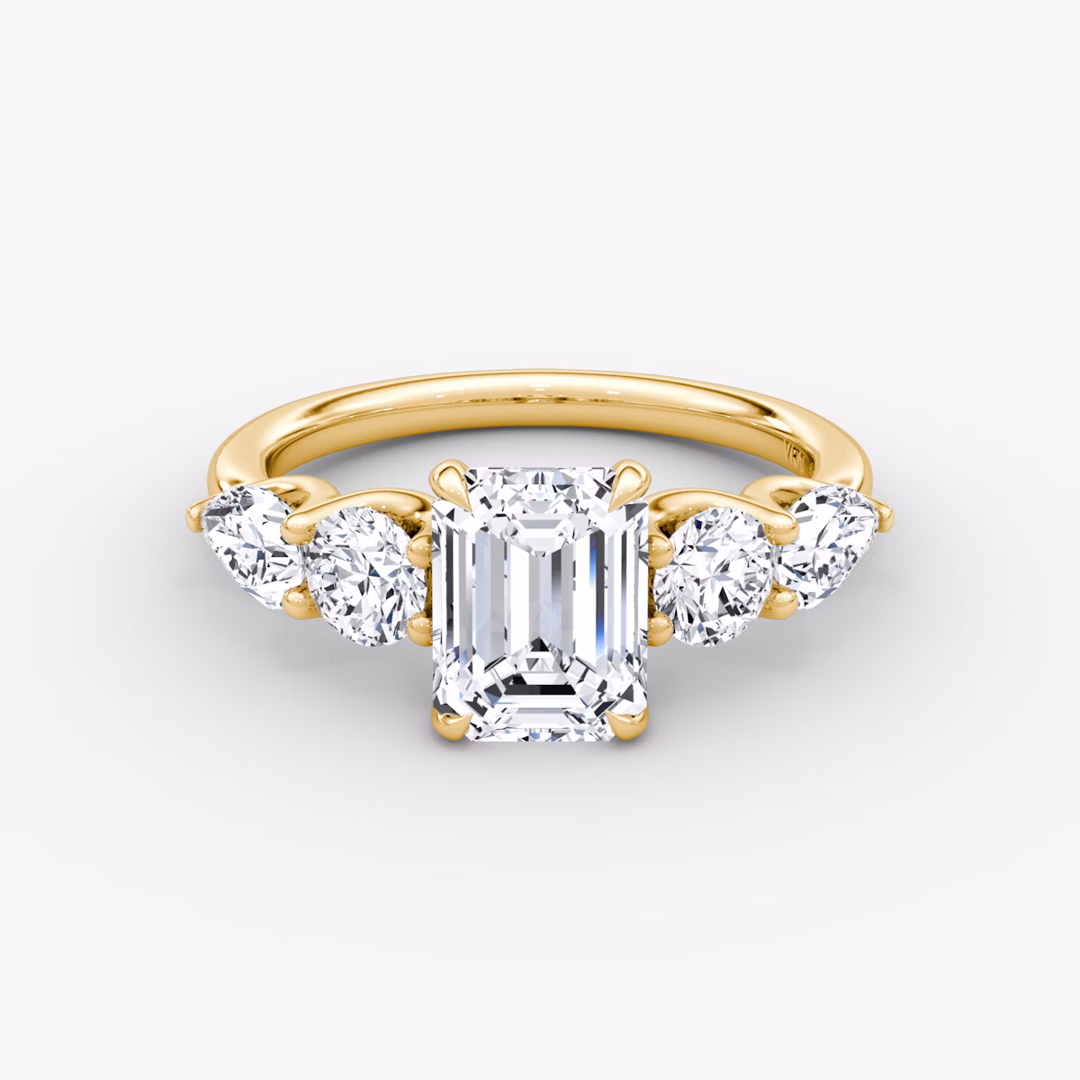 The Mixed Shape engagement ring displays an array of five VRAI created diamonds of varying carat weights and diamond shapes. Choose between Round Brilliant and Pear side stones or Emerald and Round Brilliant side stones to uniquely spotlight your center VRAI created diamond. An instant classic, the Mixed Shape effortlessly blends differing diamond shapes and details to create an unforgettable design as unique as your love.