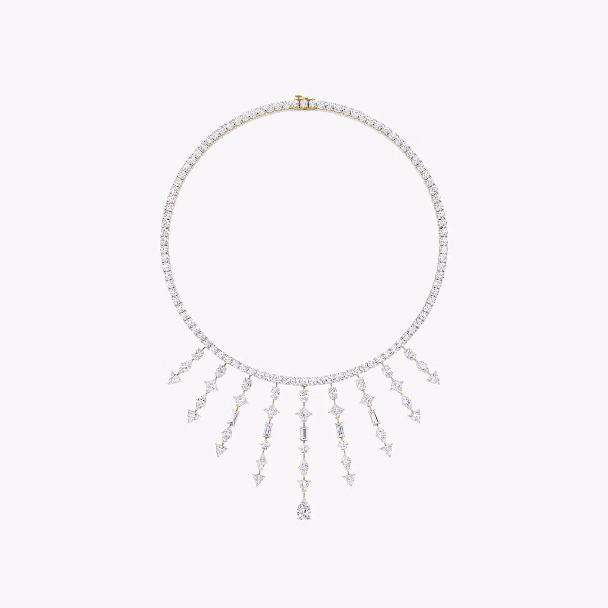 The ultimate expression of bold elegance and scintillating style, the Mixed Shape Cascade Necklace boasts nearly 50 carats of VRAI created diamonds that cascade down to dramatic effect. An endless array of Round Brilliant VRAI created diamonds are linked together in a 14k solid gold setting, while seven distinctive diamond shapes dangle below for added allure.